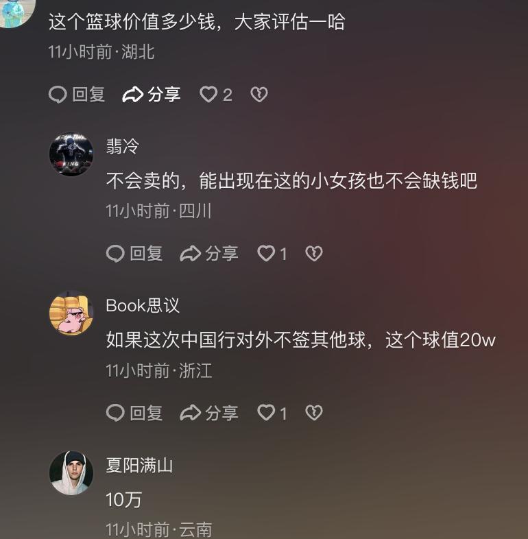 目前有球迷估价。这个签名的篮球价格有可能达到10到20万左右。因为他是詹姆斯参加中国行的首个签名,而且小女孩拿的还是湖人主场的篮球,这个价格是完全不一样的。在这个事情发酵之后,我们看到中国小女孩她的父亲也在社交平台接连发布了多条动态,晒出了当天自己和女儿的合照,还透露是女儿主动走过去索要签名的。当时这位父亲对他的女儿说,你想要签名自己去。结果这个小女孩就主动走过去了。
